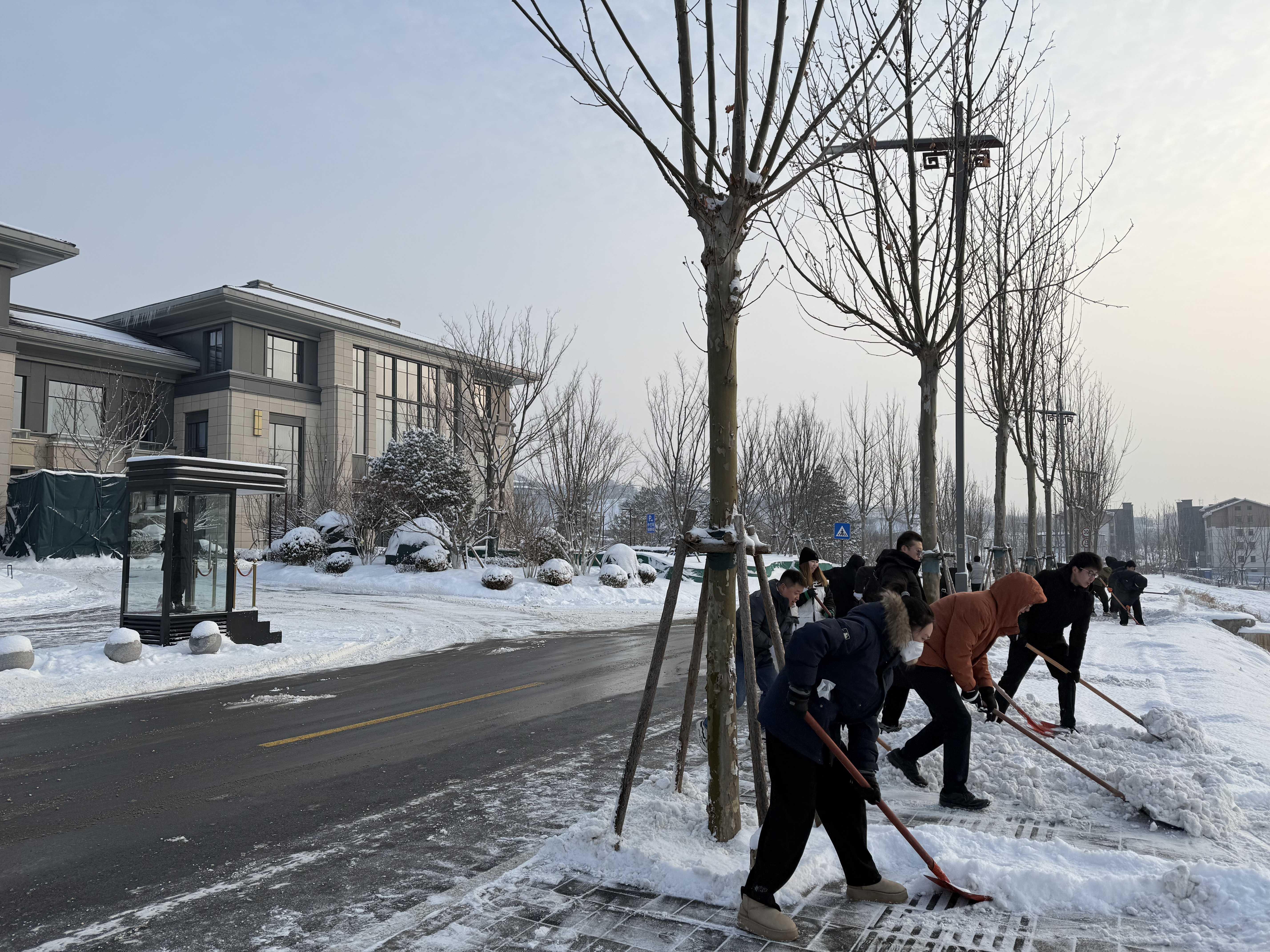 雪情就是集結號,責任面前勇擔當。面對降雪帶來的交通壓力,公司提前研判天氣態勢,連夜召開專項調度會議,科學規劃分區方案,明確“先民生后景觀、機械人工協同”作業思路,將行人出行安全列為首要任務。今日破曉,各作業組攜除雪設備分赴現場,黨員干部帶頭沖鋒,全體人員合力清掃主次干道,重點攻克易結冰隱患點,精細化推進7萬余平米區域除雪作業。