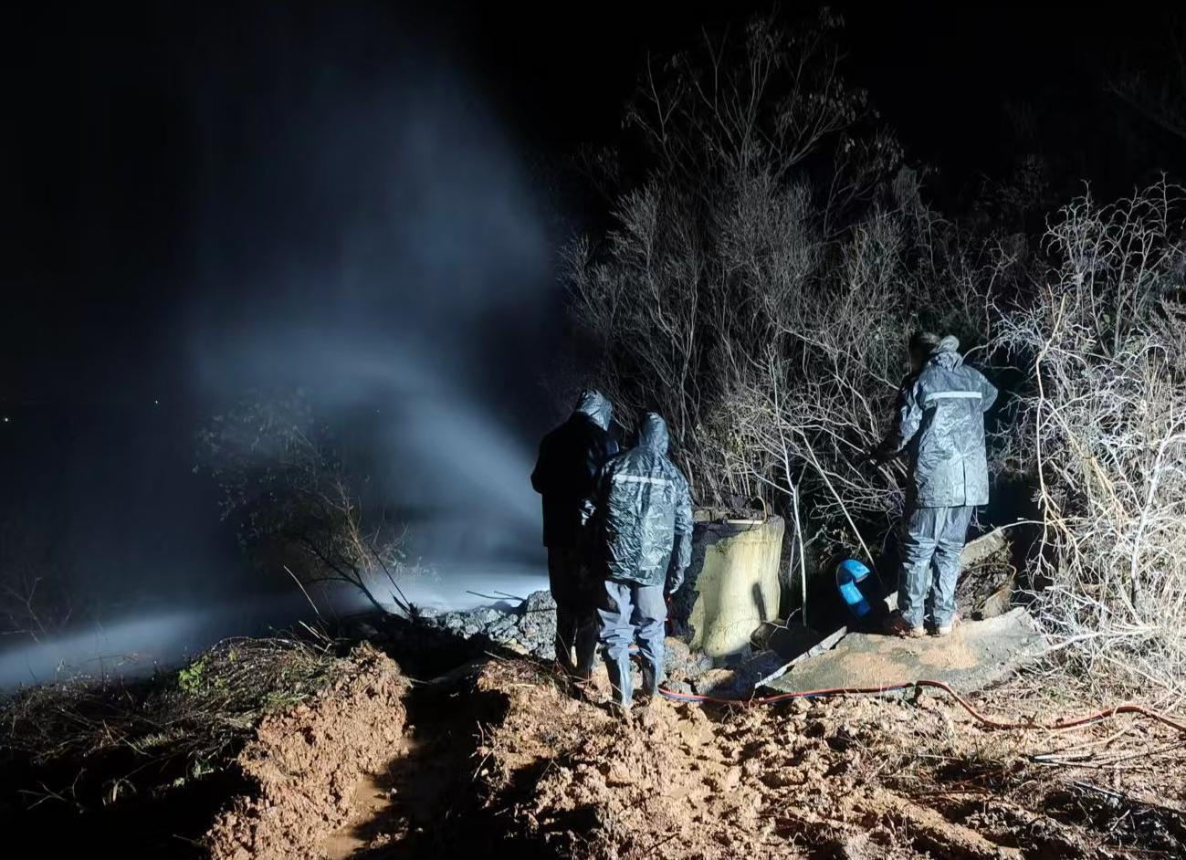 現場寒風凜冽、泥濘濕滑,搶修隊員頂著噴水艱難作業,針對水壓大、配件短缺、閥門關閉不嚴等難題群策群力。17時30分停水后,搶修人員又發現一級泵站站后閥門井被淹、旁通管漏水,隨即兵分兩路展開攻堅。彼時終端池水量持續下降,全體人員爭分奪秒、緊張奮戰,不敢有絲毫懈怠。