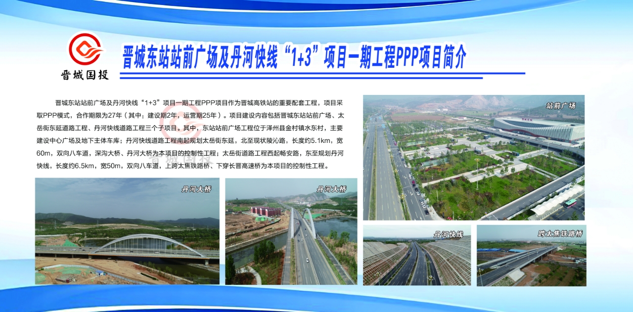 晉城東站站前廣場及丹河快線“1+3”項目一期工程PPP項目作為晉城高鐵站的重要配套工程,項目采取PPP模式,合作期限為27年(其中:建設期2年,運營期25年)。項目建設內容包括晉城東站站前廣場、太岳街東延道路工程、丹河快線道路工程三個子項目。其中,東站站前廣場工程位于澤州縣金村鎮水東村,主要建設中心廣場及地下主體車庫;丹河快線道路工程南起規劃太岳街東延,北至現狀陵沁路,長度約5.1km,寬60m,雙向八車道,深溝大橋、丹河大橋為本項目的控制性工程;太岳街道路工程西起暢安路,東至規劃丹河快線,長度約6.5km,寬50m,雙向八車道,上跨太焦鐵路橋、下穿長晉高速橋為本項目的控制性工程。
