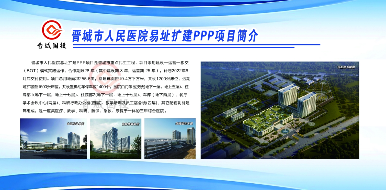 晉城市人民醫院易址擴建PPP項目是晉城市重點民生工程,項目采用建設—運營—移交(BOT)模式實施運作,合作期限28年(其中建設期3年,運營期25年)。項目總用地面積255.5畝,總建筑面積19.4萬平方米,共設1200張床位,遠期可擴容至1500張床位,共設置機動車停車位1400個。醫院由門診醫技樓(地下一層,地上五層)、住院部1(地下一層,地上十七層)、住院部2(地下一層,地上十七層)、車庫(地下兩層)、餐廳學術會議中心(兩層)、科研行政辦公樓(四層)、教學培訓及員工宿舍樓(四層)、其它配套功能建筑組成,是一座集醫療、教學、科研、防保、急救、康復于一體的三甲綜合醫院。